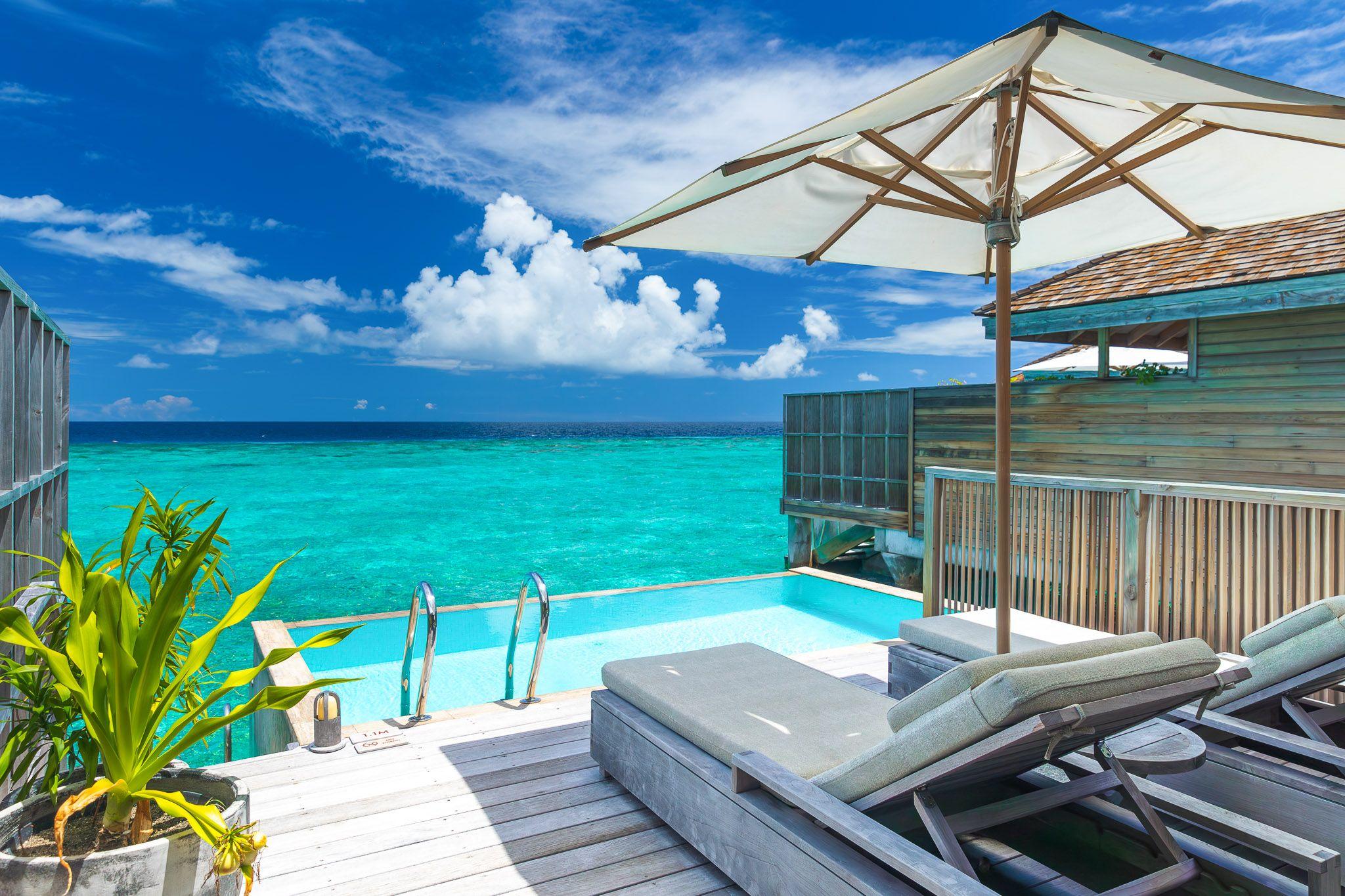 TRANSFER & LOCATION: The island is accessible via a 15-minute seaplane transfer or a 60-minute luxury speedboat journey. The resort features 50 villas, including Beach Pool Villas and Ocean Pool Villas, situated on a 4-hectare private island with a surrounding house reef.