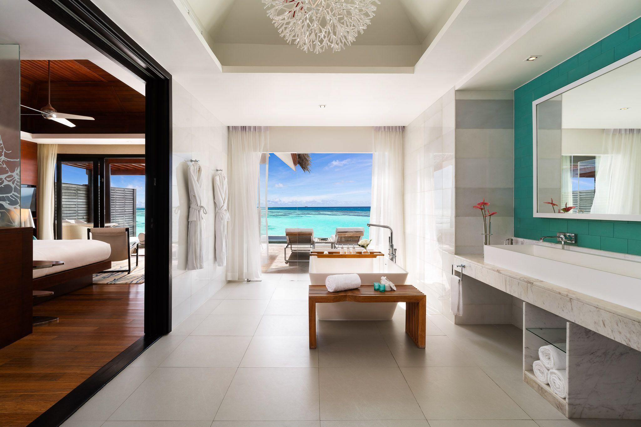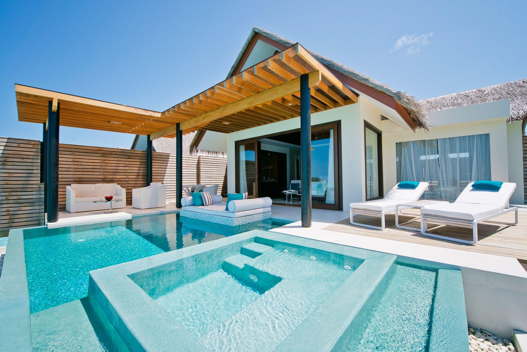 TRANSFER & LOCATION: The island is accessible via a Seaplane (45 minutes) or a Domestic Flight (40 minutes) followed by a Speedboat (10 minutes). The resort features 134 villas, including Beach Pool Villas and Over Water Pool Villas, situated on twin islands (Chill and Play) with a private surf break known as Vodi.